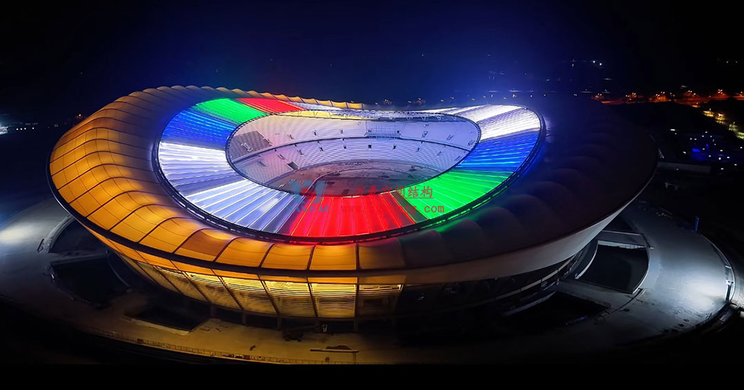 在項目現場,代表團首先聽取了工程節點匯報,詳細了解了體育場屋蓋的施工進展與技術難點。隨后,在項目負責人的引導下參觀了場館建設現場——內圈128片超寬超長大型ETFE氣囊氣枕與外圈64片PTFE膜材共同構成“薄如蟬翼”的屋蓋系統,既實現了通透開闊的視覺效果,又保障了結構的穩固性與環保性。夜幕降臨時,LED燈光與膜材巧妙融合,綻放出絢爛奪目的光影效果,盡顯未來科幻感 。從空中俯瞰,流線型的膜結構屋面與太湖風光交相輝映,“風從太湖來”的設計巧思讓代表團印象深刻,紛紛贊嘆這是“技術與自然的完美融合”。
