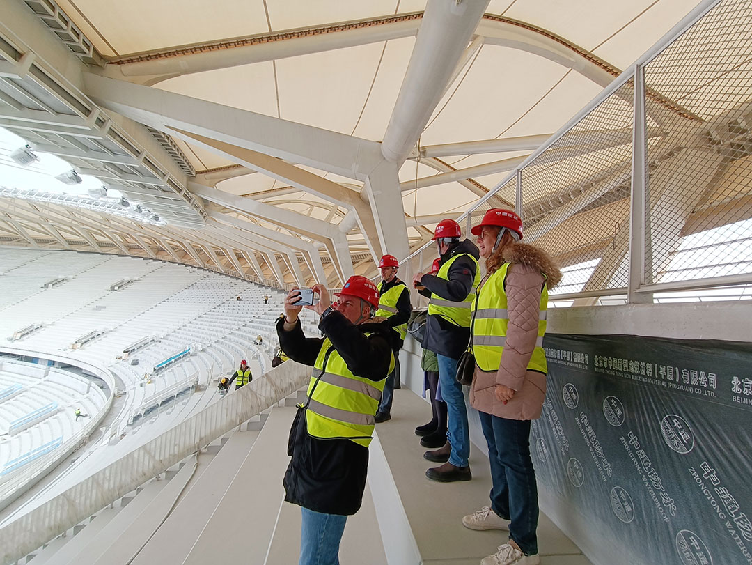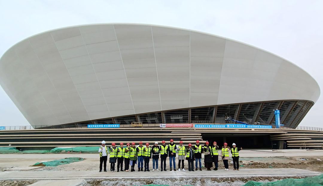 1月29日,代表團驅車前往無錫奧體中心,開啟第二站實地考察。作為環太湖區域稀有的臨湖綜合體育場館群,無錫奧體中心以“白鷺振翅”為設計理念,其造型設計和承建,堪稱鋼膜結構應用的經典力作。
